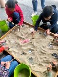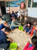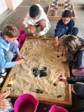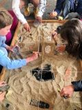 Les élèves se sont répartis autour de 5 « zones de fouille » représentant chacune une période précise de l’histoire de l’Homme (2 X Paléolithique, Néolithique, Âges des métaux, Antiquité). Armés de pinceaux, ils ont dégagé minutieusement de nombreux objets enfouis dans le sable.